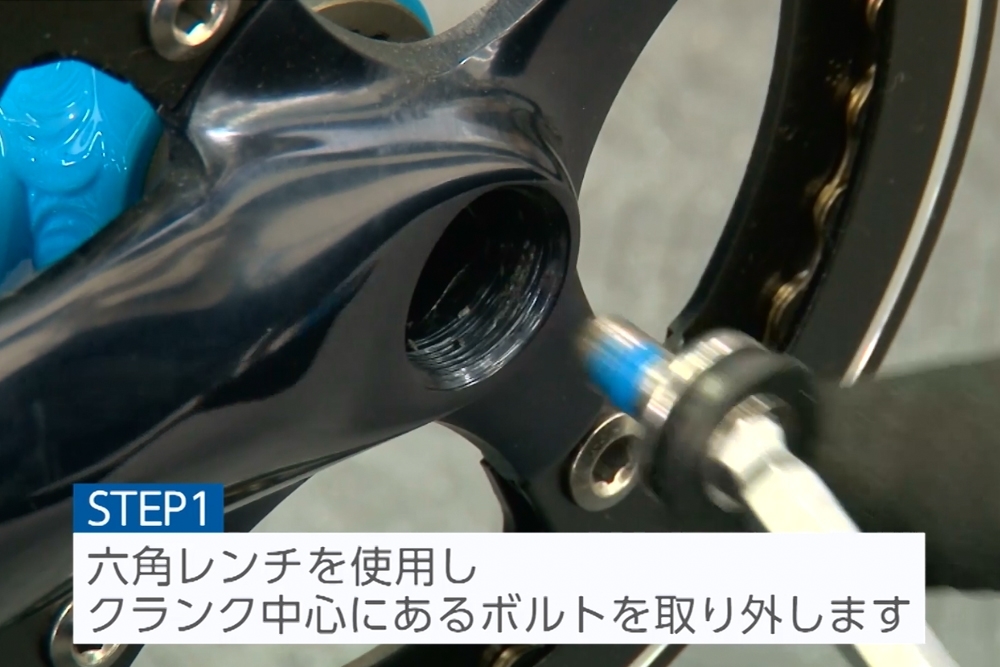 クランクの中心にあるボルトを外します六角レンチを使用して、クランクの中心にあるボルトを外します。※ネジは左に回すと外れます。ボルトを外しますが、これだけではクランクは外れません。