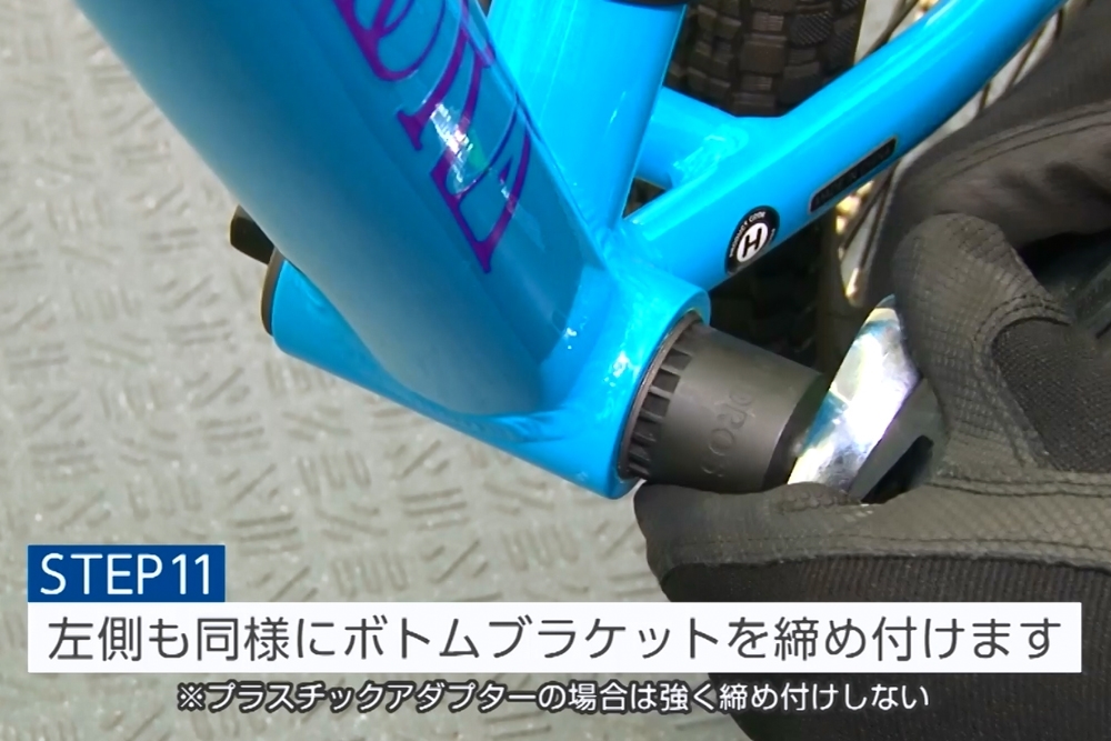 左側のアダプターを1cm程度はめ込んだら、右側のBBをボトムブラケットツールで50-70N·mで締めつけます。