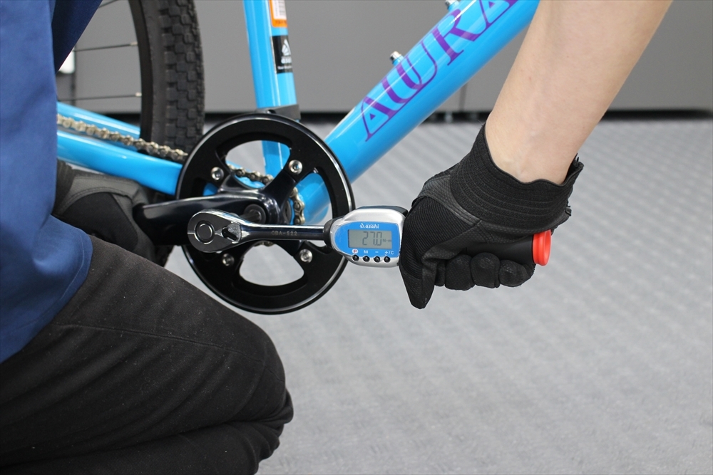 クランクの中心にボルトを入れ、レンチで35-50 N·mで締めつけます、規定トルクまで締めこんでからチェーンをかけます。
