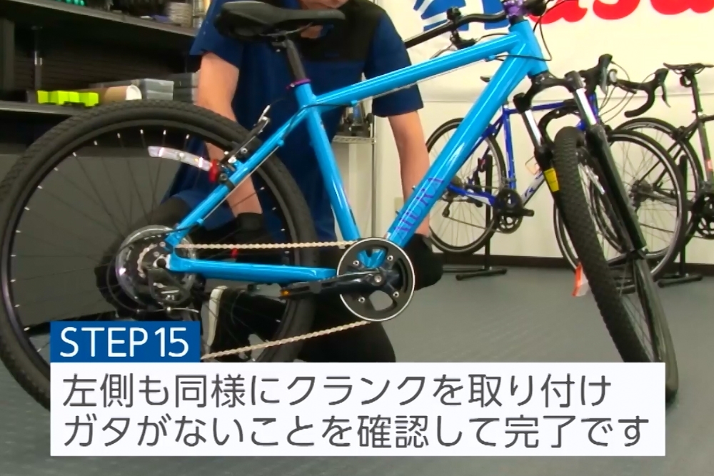 左側は右側と180°になるようにはめていきます。ISISやオクタリンクの場合は嵌合のつめが多数あるため、無意識でクランクアームを取り付けると、左右のアームがズレてしまうこともあります。ガタなどがないことを確認し終了です。